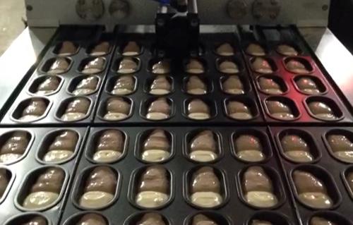 本機專為制作雙色蛋糕而設計。首先噴油機將油均勻地噴在模腔里,接著模盤自動移動到成型部分,成型嘴同時往模盤里填充定量的雙色面漿。