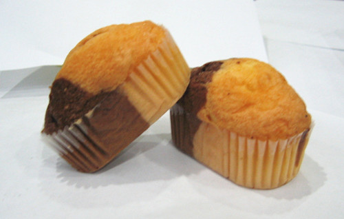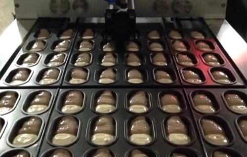 本機專為制作雙色紙杯蛋糕而設計。落杯機首先將紙杯落到模腔里,然后模盤自動移動到成型部分,成型嘴同時將定量的雙色面漿填充到紙杯里。