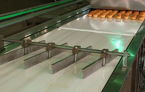 冷卻殺菌是包裝前的最后一個程序。產(chǎn)品出烤爐后經(jīng)過冷卻線進(jìn)行快速而高效的冷卻,在有效降低產(chǎn)品溫度的同時不會造成變形或裂紋。接著產(chǎn)品被送往紫外線殺菌線進(jìn)行殺菌,以提高食品質(zhì)量和保質(zhì)期。輸送帶長度可根據(jù)生產(chǎn)能力定制。