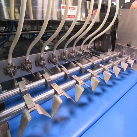 該注心機解決了一臺機器即可同時注入3種口味的問題,可用于面包、蛋糕和甜甜圈。注料值可調,大約5-20克/次。產品將會被自動排成一列注醬料。