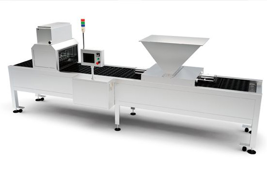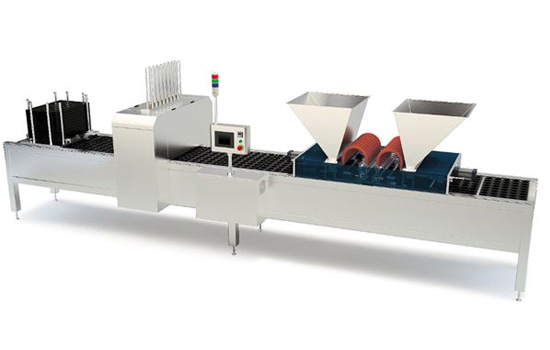 該DEB型號的成型機(jī)用于平盤注漿,輸送帶連續(xù)前行,成型頭感應(yīng)到模盤后開始填充面糊。成型頭可根據(jù)模盤大小進(jìn)行更換,適用于需要一次性進(jìn)行大量注漿的產(chǎn)品。