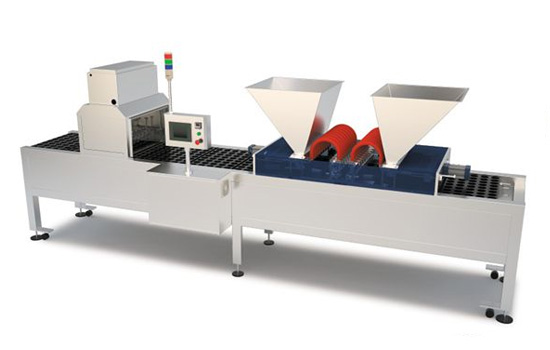 本機(jī)專為制作雙色紙杯蛋糕而設(shè)計(jì)。落杯機(jī)首先將紙杯落到模腔里,然后模盤自動(dòng)移動(dòng)到成型部分,成型嘴同時(shí)將定量的雙色面漿填充到紙杯里。
