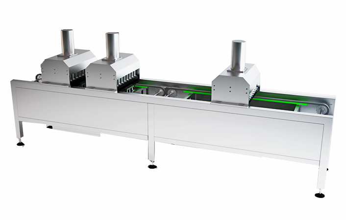 該模盤清洗機(jī)有助于清除模盤中的殘留物。它包括毛刷清洗和吹氣系統(tǒng)。將模盤放在機(jī)器輸送帶上,首先將刷子降下來清潔模盤,然后模盤自動(dòng)移動(dòng)到下個(gè)動(dòng)作位置,吹氣系統(tǒng)將吹走食物殘留物,完成清洗。